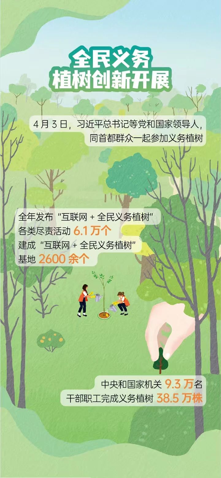 全國(guó)人大、全國(guó)政協(xié)、中央軍委領(lǐng)導(dǎo)同志分別集體參加義務(wù)植樹(shù)活動(dòng)。第23次共和國(guó)部長(zhǎng)義務(wù)植樹(shù)活動(dòng)在京舉行,137名部級(jí)領(lǐng)導(dǎo)履“植”盡責(zé)。31個(gè)省(自治區(qū)、直轄市)及新疆生產(chǎn)建設(shè)兵團(tuán)組織開(kāi)展省級(jí)領(lǐng)導(dǎo)集體義務(wù)植樹(shù)活動(dòng),400余個(gè)地級(jí)市組織開(kāi)展市級(jí)領(lǐng)導(dǎo)集體義務(wù)植樹(shù)活動(dòng)。全國(guó)綠化委員會(huì)辦公室持續(xù)推進(jìn)“互聯(lián)網(wǎng)+全民義務(wù)植樹(shù)”,全年發(fā)布各類盡責(zé)活動(dòng)6.1萬(wàn)個(gè),建成“互聯(lián)網(wǎng)+全民義務(wù)植樹(shù)”基地2600余個(gè),為適齡公民就近、適時(shí)、多樣盡責(zé)提供服務(wù)。