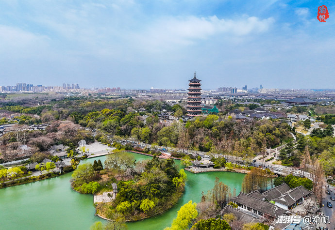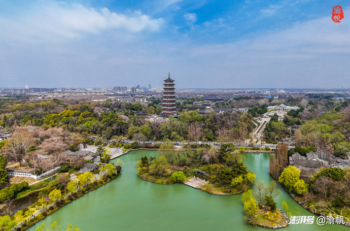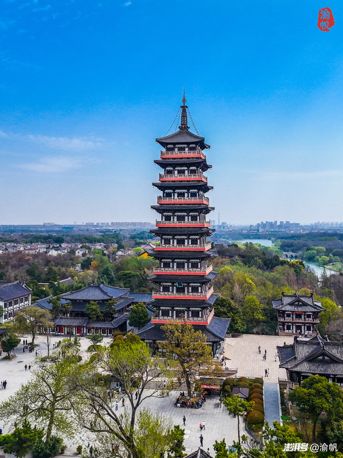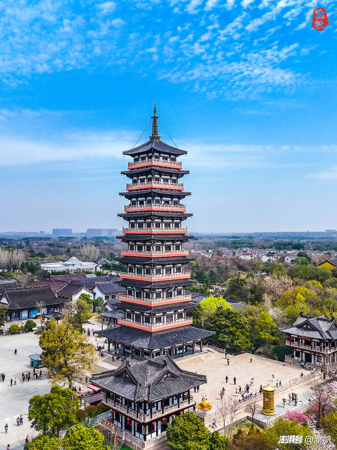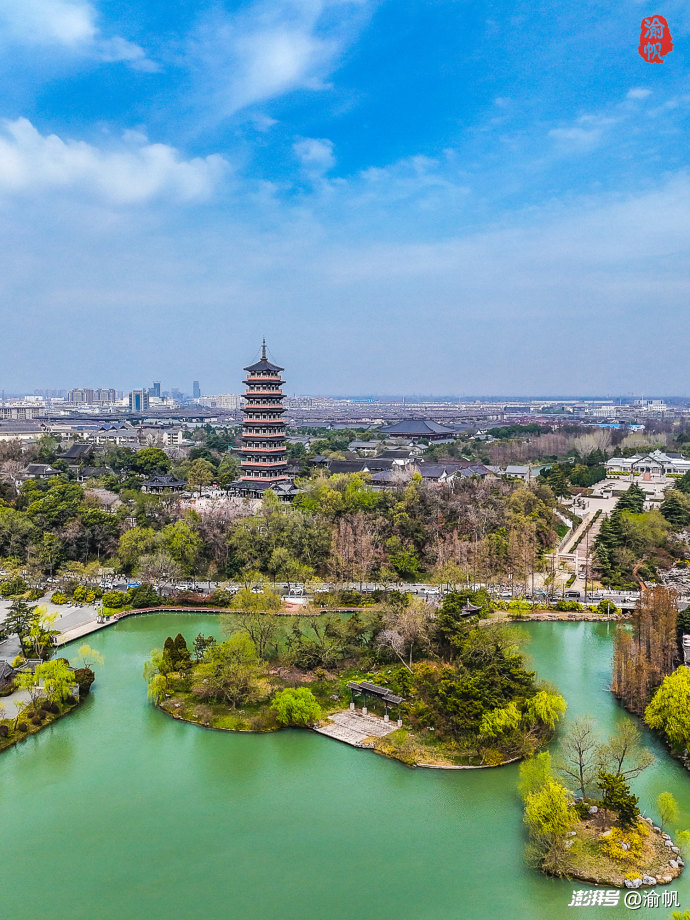 “步步登高皆是悟,層層觀景俱成詩”。這座九層佛塔重建于1995年,卻完美復(fù)刻了隋唐風(fēng)韻。當(dāng)我升起無人機來,環(huán)塔飛行,整個揚州城盡收眼底:瘦西湖如翡翠玉帶,文昌閣似青銅印章,古運河蜿蜒如龍。塔檐銅鈴在風(fēng)中奏響千年梵音,我忽然懂得為何李白曾在此留下"寶塔凌蒼蒼,登攀覽四荒"的慨嘆,畢竟,只有站在歷史的高度,方能丈量文明的廣度。