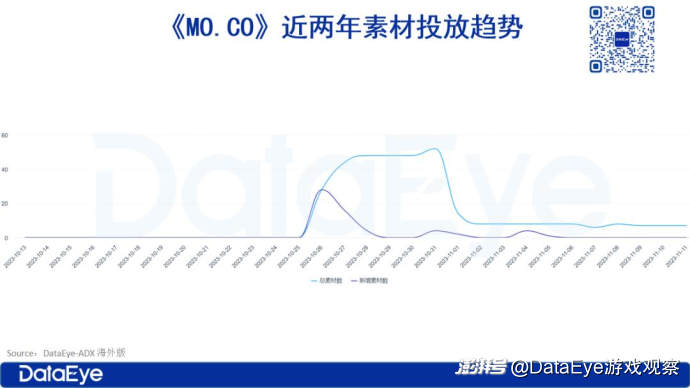 DataEye-ADX數(shù)據(jù)顯示,《MO.CO》嚴(yán)格去重后僅投放191組(圖片+視頻)素材,時間集中在2023年10月到11月游戲測試期間投,日均在40(圖片+視頻)左右。時間拉長到上線前,完全沒有任何買量動作。