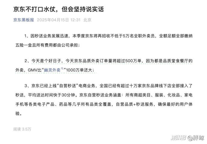 而宣傳片釋出僅幾小時后,京東即刻發(fā)出了“京東不打口水仗,但會堅持說實話”一文,做出回應(yīng)。京東一方面表示自營秒送電商業(yè)務(wù)(即京東即時零售板塊業(yè)務(wù))已然成熟,有超過 10 萬家品牌線下店接入,平均送達(dá)時間小于 30 分鐘;另一方面慶祝自身外賣業(yè)務(wù)發(fā)展迅速,日訂單量超過 500 萬,并以“幽靈外賣”反擊美團。