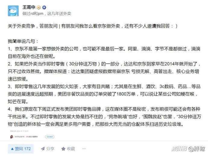 美團閃購的品牌獨立化,被人推測是美團對京東侵入外賣腹地的反擊行為。上周美團核心本地商業(yè) CEO 王莆中在社交平臺回應(yīng)“如何看待京東外賣”的問題時,他用了“收效甚微”“大而無當(dāng)?shù)膫}配體系”等詞形容京東,并放出美團閃購成為獨立品牌的消息。