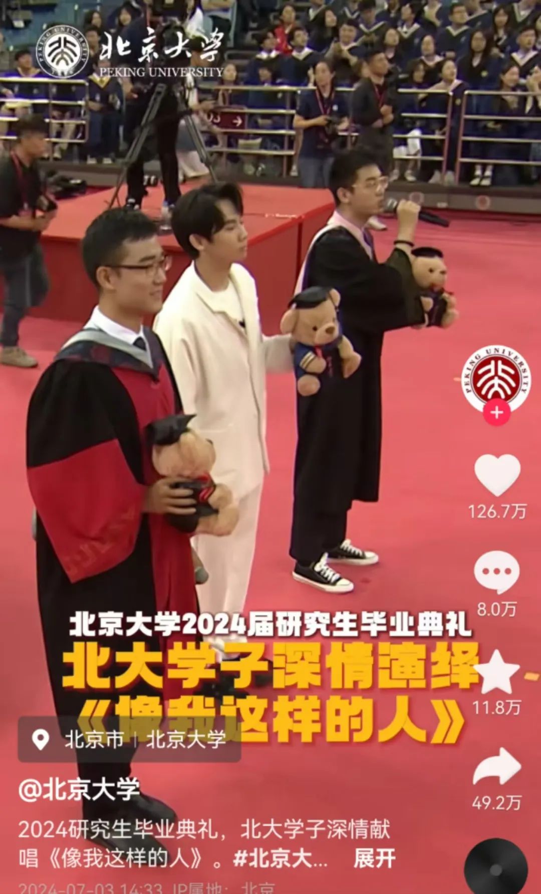 緊隨其后的是“實(shí)時(shí)熱點(diǎn)類”視頻。這類視頻通常與社會(huì)熱點(diǎn),網(wǎng)絡(luò)熱?;蛐@大事件相關(guān),如高考、畢業(yè)典禮、明星校友返校等。如北京大學(xué)畢業(yè)典禮上學(xué)生獻(xiàn)唱《像我這樣的人》的短視頻,一經(jīng)發(fā)布便吸引了數(shù)百萬(wàn)的流量,在看客的調(diào)侃與自嘲中狂攬了126萬(wàn)的點(diǎn)贊量。