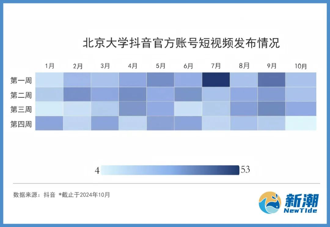 以北京大學(xué)為例,其短視頻賬號(hào)在不同時(shí)間節(jié)點(diǎn)的發(fā)布頻率存在明顯差異。從可視化圖表可以看出,7月的視頻發(fā)布量顯著高于全年其他月份,達(dá)到全年峰值。這一時(shí)間段正值高校錄取工作進(jìn)行期間,往往伴隨著大量關(guān)于高考志愿填報(bào)、錄取通知書等內(nèi)容的集中發(fā)布,說(shuō)明北大在重要招生節(jié)點(diǎn)加大了內(nèi)容投放力度。