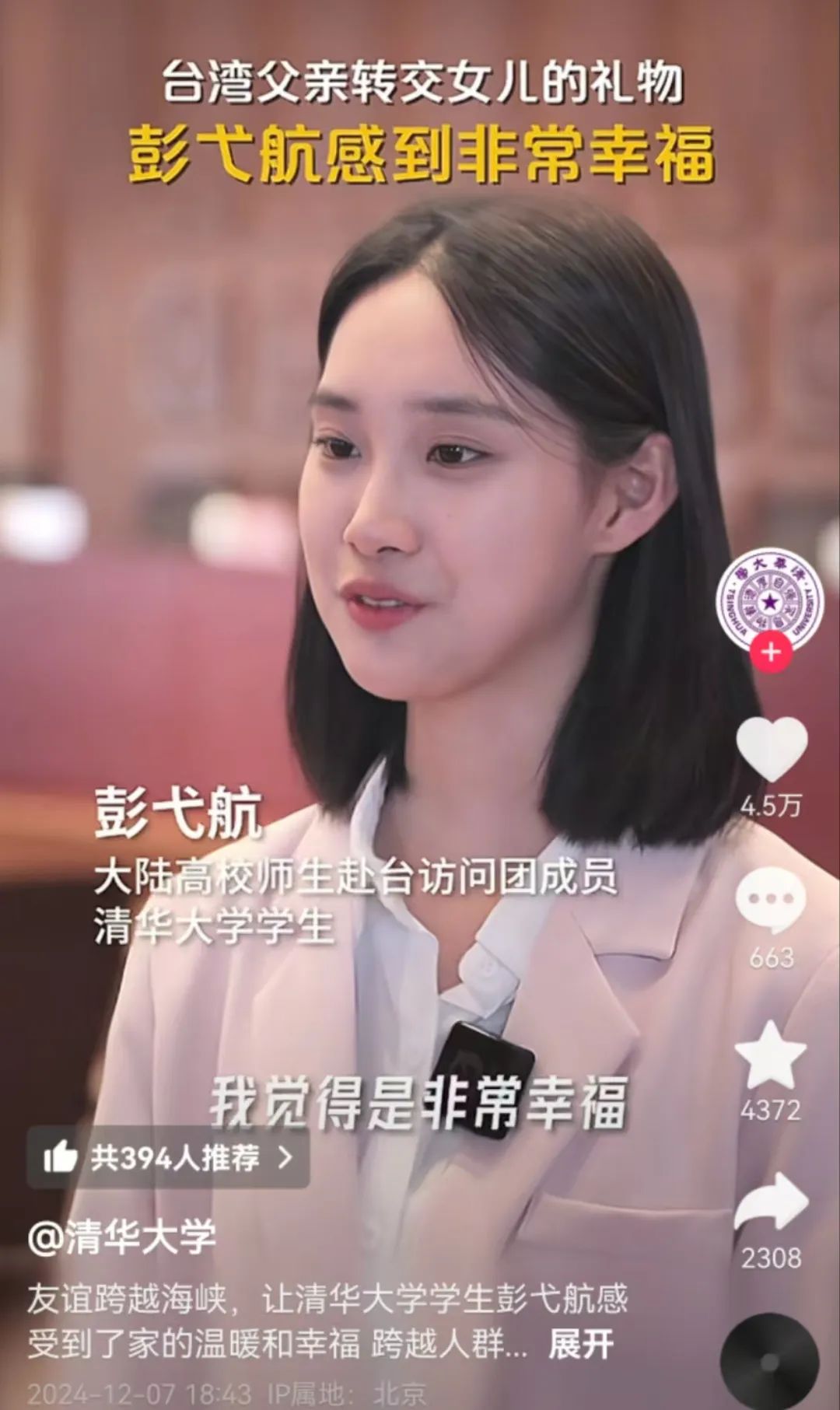 在這十所高校所發(fā)布的視頻中,人物故事類的視頻最受用戶青睞,以48112.9的平均點(diǎn)贊量遙遙領(lǐng)先,這類視頻往往講述師生的成長(zhǎng)經(jīng)歷、校友傳奇故事等,如清華大學(xué)學(xué)生彭弋航,通過(guò)講述自己作為大陸高校師生赴臺(tái)訪問(wèn)團(tuán)成員赴臺(tái)參加交流訪問(wèn)活動(dòng)的經(jīng)歷,收獲了4.5萬(wàn)點(diǎn)贊。