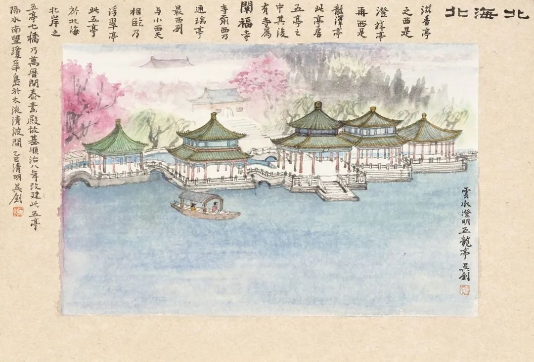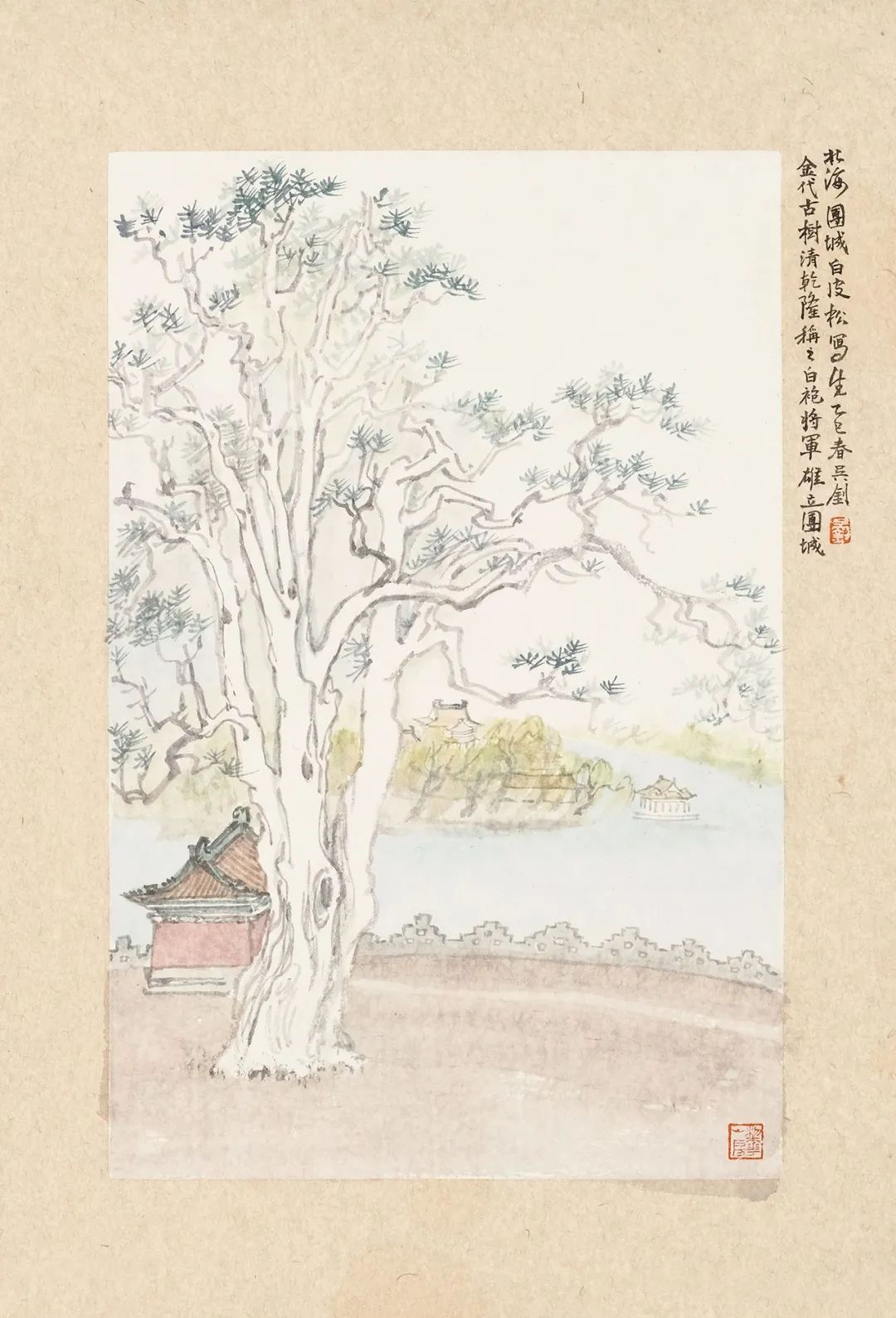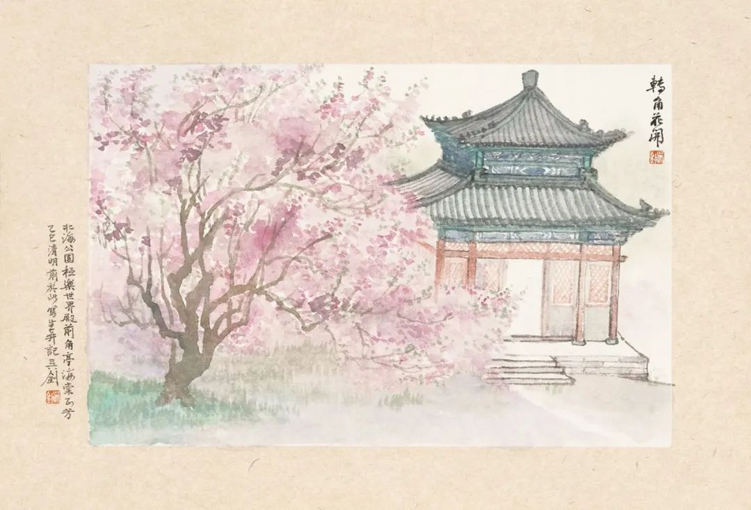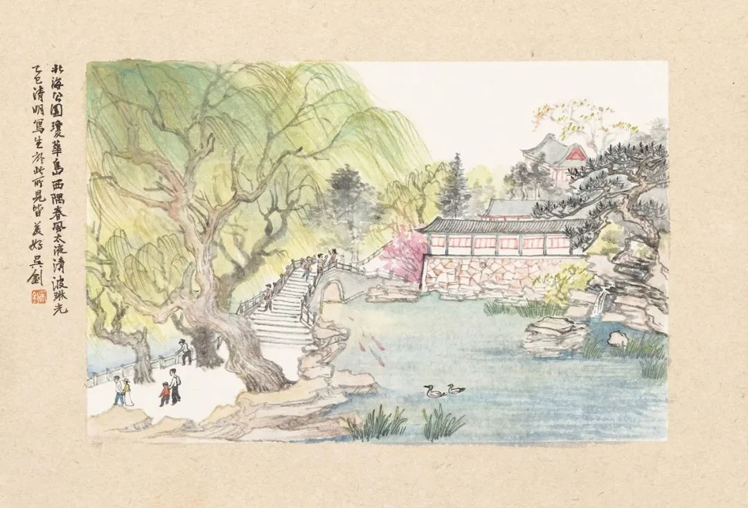 瓊島春陰,白塔巍峨,在綠樹繁花簇?fù)硐赂@莊嚴(yán)肅穆。那掩映于山林間的古建筑,承載著歷史的厚重,于無聲處傳遞著歲月的故事。畫中的每一處景致,都融入了畫家對北海公園的深情。