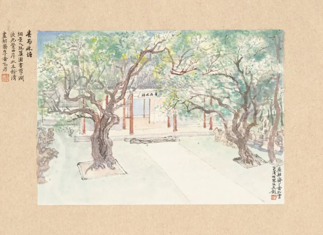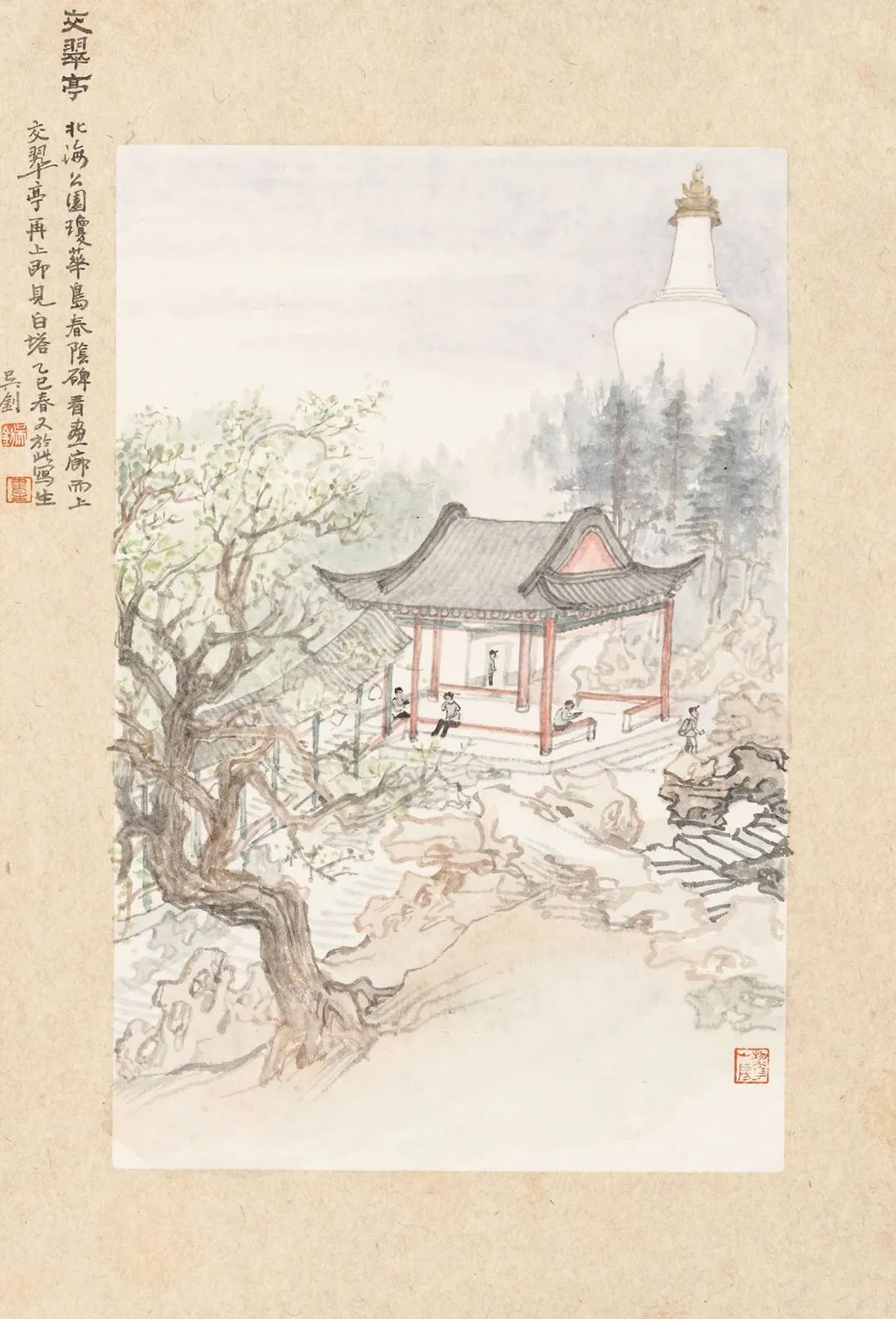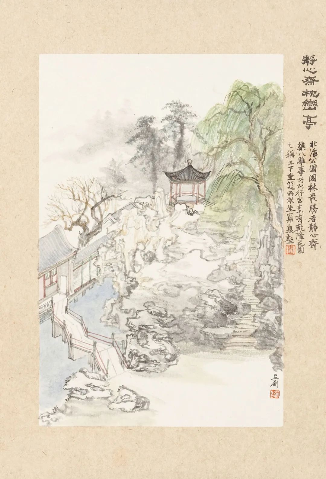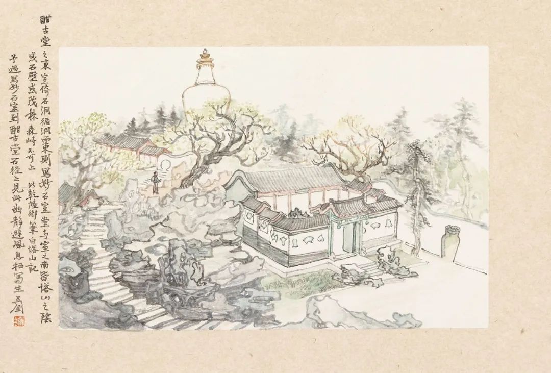 瓊島春陰,白塔巍峨,在綠樹繁花簇?fù)硐赂@莊嚴(yán)肅穆。那掩映于山林間的古建筑,承載著歷史的厚重,于無聲處傳遞著歲月的故事。畫中的每一處景致,都融入了畫家對北海公園的深情。