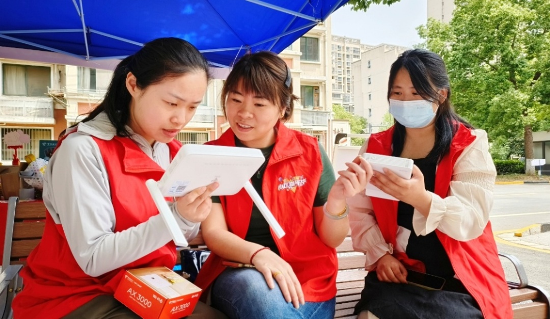 智慧家庭工程師團隊在社區(qū)內(nèi)開始網(wǎng)絡(luò)檢測與區(qū)域信號優(yōu)化。他們背著工具包,與社區(qū)監(jiān)控調(diào)度室負責(zé)人溝通,檢查社區(qū)視頻服務(wù)平臺和機房;走進居民家中,了解家庭網(wǎng)絡(luò)狀況。蠡湖分局團隊負責(zé)人馮婷婷、夏怡心帶著門店員工手把手地教老人們?nèi)绾问褂弥悄苁謾C的基本功能;給外來務(wù)工人員、居家人員推薦各種智家設(shè)備并向他們普及不同網(wǎng)線的優(yōu)劣,讓聽者豁然開朗。