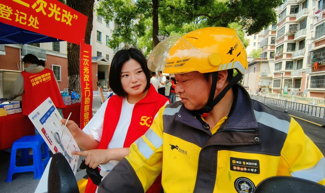 盡管假日中的社區(qū)人流并不密集,但電信志愿者還是悉心接待著每位居民。陽光和綠蔭映襯著青春的形象、歡樂的氛圍。