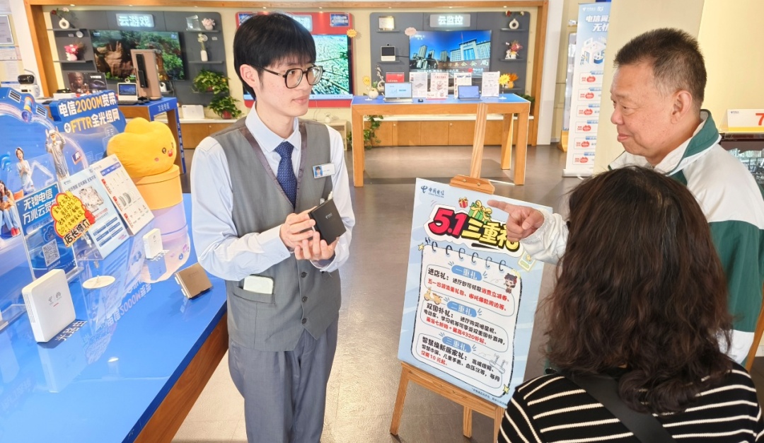 5月4日,在無錫經(jīng)貿(mào)路的農(nóng)民安置社區(qū),一些不同年齡的人在體驗電信新型全光WiFi、智能面板、國產(chǎn)爆款手機等假日新品。在市中心的人民路天翼展廳,可以搭載AI大模型的天翼云盤、AI手機等,老少咸宜,頗受關(guān)注。五一假期內(nèi),在諸多景區(qū)的游玩者,一部手機可以盡情拍攝一路繁花。