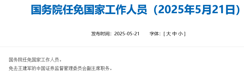 5月21日,人社部官網(wǎng)發(fā)布國(guó)務(wù)院任免國(guó)家工作人員公告:免去王建軍的證監(jiān)會(huì)副主席職務(wù)。