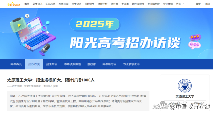 據(jù)陽光高考官網(wǎng)消息,近日,太原理工大學(xué)招生與就業(yè)工作部部長李栩在接受訪談時提到,2025年太原理工大學(xué)繼續(xù)擴(kuò)大招生規(guī)模,較去年預(yù)計增加1000人,在全國31個省區(qū)市均有招生計劃,分省招生計劃預(yù)計會在往年的基礎(chǔ)上略微上調(diào)。