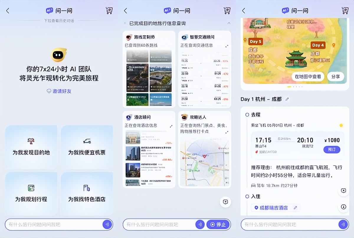盡管都還處在比較早期的階段,但一些專注垂直場(chǎng)景的 AI 智能體已經(jīng)在慢慢接近理想體驗(yàn)。比如在飛豬「問(wèn)一問(wèn)」,你說(shuō)「我想去云南旅游,請(qǐng)你幫我制定一份旅游計(jì)劃」,智能體就會(huì)自動(dòng)查找來(lái)回機(jī)票、旅游攻略、酒店信息、景點(diǎn)門(mén)票和地圖信息等,生成一份真正可用、可便捷下單的旅游計(jì)劃。
