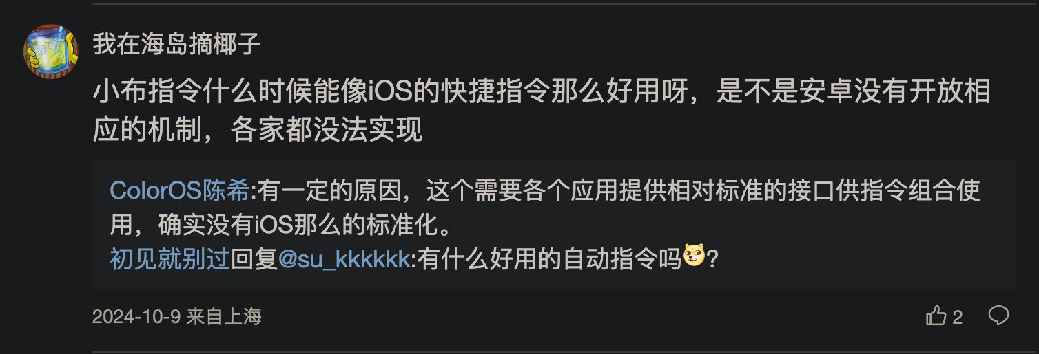 在另一邊,國(guó)產(chǎn)安卓手機(jī)廠商也早早引入了快捷指令這種交互形式,盡管系統(tǒng)底層的打通程度或許不能與 iOS 相比,就像 ColorOS 負(fù)責(zé)人陳希說(shuō)的,「需要各個(gè)應(yīng)用提供相對(duì)標(biāo)準(zhǔn)的接口供指令組合使用,確實(shí)沒(méi)有 iOS 那么的標(biāo)準(zhǔn)化?!?/strong>但以大模型為基礎(chǔ)、以代理操作為目標(biāo)的智能體,有潛力快速?gòu)浹a(bǔ)這種劣勢(shì)。