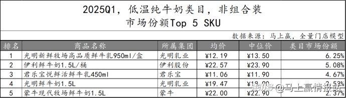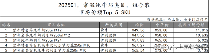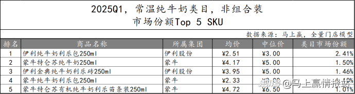 對市場份額TOP 5 SKU進(jìn)行梳理可以看到,非組合裝常溫純牛奶產(chǎn)品的TOP SKU中,有三款歸屬于蒙牛集團(tuán),另外兩款則屬于伊利股份集團(tuán),規(guī)格均為250毫升,但中位價(jià)從3-6元均有。