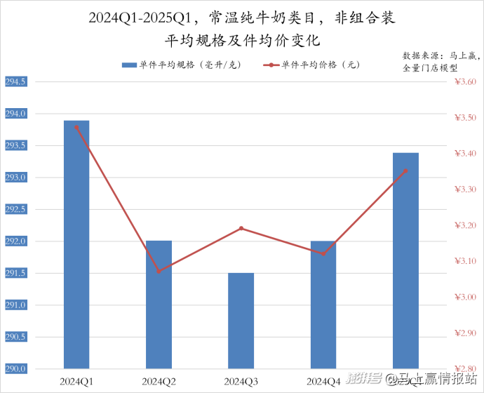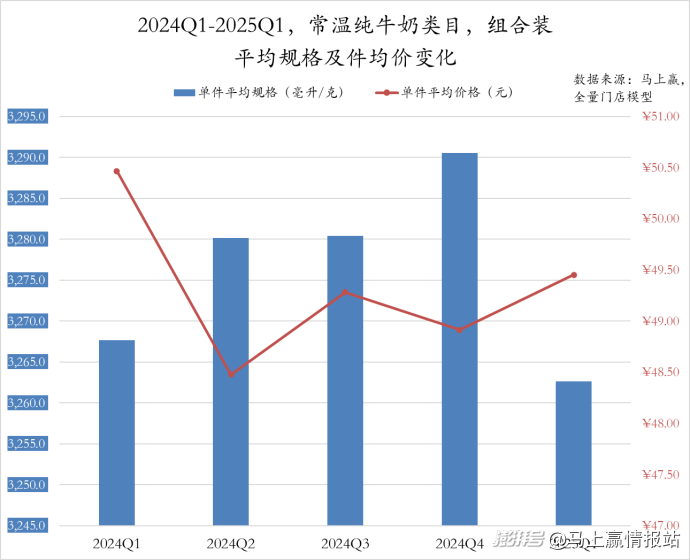 2024Q1至2025Q1,常溫純牛奶類目非組合裝的件均規(guī)格呈現(xiàn)“U型”變動(dòng),2024Q1至Q3從294毫升縮減至291.5毫升,而后由逐季回升至294毫升,但仍低于2024年同期水平。件均價(jià)同樣經(jīng)歷了下滑與一定程度上的回調(diào),2024Q2驟減至3.1元后經(jīng)過三個(gè)季度波動(dòng)回調(diào)至2025Q1的3.3元。