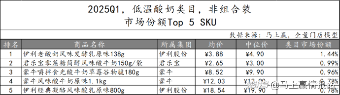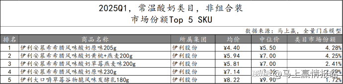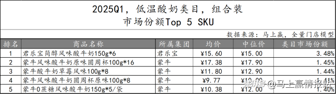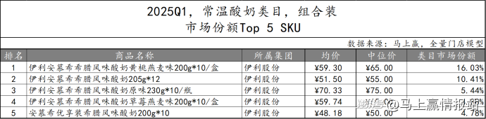 2025Q1常溫酸奶類目組合裝產(chǎn)品TOP 5 SKU中,伊利股份依舊包攬榜單,市場份額合計(jì)41.54%,其安慕希系列產(chǎn)品更是包含不同口味和規(guī)格。