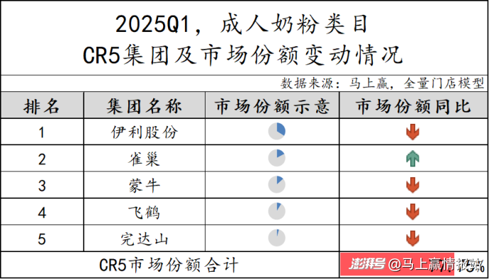 成人奶粉類目的CR5集團(tuán)由伊利股份、雀巢、蒙牛、飛鶴和完達(dá)山組成,市場份額合計(jì)77.75%,雖較2024Q4有所降低,但市場集中度仍處于高位。從同比變化來看,除雀巢集團(tuán)同比增長外,其余集團(tuán)市場份額均呈現(xiàn)同比下滑。