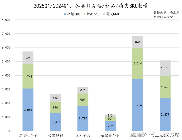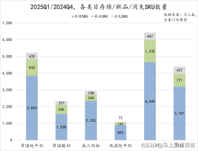 從2024Q1/2025Q1的同比情況來看,低溫酸奶是SKU總量最多的類目,存續(xù)SKU達(dá)3736款,新品SKU數(shù)量也顯著高于消失SKU的875款,顯示出該類目產(chǎn)品迭代快的同時(shí),新品創(chuàng)新也較為活躍。常溫純牛奶的新品SKU數(shù)量也較為突出,但其消失SKU數(shù)量同樣較高。相比之下,成人奶粉和常溫酸奶雖SKU總量較小,但仍然出一定的新品SKU凈增長。低溫純牛奶在六個(gè)類目中SKU總量最小,但新品SKU也達(dá)到307款。整體來看,乳制品六個(gè)類目的新品SKU數(shù)量均高于消失SKU數(shù)量,雖然類目增長承壓,但沒有過于影響廠商們的出新熱情。