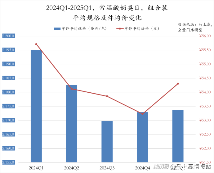 常溫酸奶類目組合裝產(chǎn)品的件均規(guī)格和件均價(jià)走勢相近,呈現(xiàn)先大幅降低后小幅回升的變動(dòng)態(tài)勢。件均規(guī)格方面,常溫酸奶類目組合裝產(chǎn)品從2024Q1的2195毫升連續(xù)縮減至2024Q3的2179毫升,隨后兩個(gè)季度小幅回升,但仍遠(yuǎn)低于2024Q1。件均價(jià)則是在2024全年接連降低至53元,或受年節(jié)禮品場景的影響,2025Q1有小幅回升。