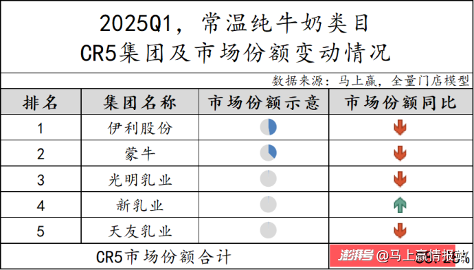 作為市場份額占比最高的類目,常溫純牛奶CR5集團(tuán)市場份額合計(jì)為88.28%,品牌集中度較高,但相比2024Q4有所降低。從市場份額變動(dòng)上看,除新乳業(yè)集團(tuán)同比提升外,其他四個(gè)集團(tuán)市場份額均呈同比下降。