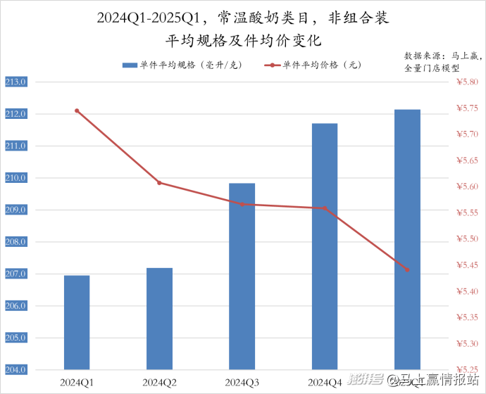 2024Q1至2025Q1,常溫酸奶非組合裝產(chǎn)品的件均規(guī)格和件均價(jià)呈現(xiàn)相反的變動(dòng)趨勢。件均規(guī)格從2024Q1的207毫升連續(xù)增長至2025Q1的212毫升,產(chǎn)品規(guī)格持續(xù)擴(kuò)大。而件均價(jià)則是持續(xù)走低,并經(jīng)歷了2024Q2和2025Q1的兩次較為明顯的下滑,類目整體提量降價(jià)的態(tài)勢依然較為明顯。