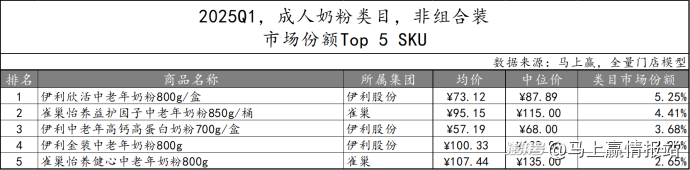 在成人奶粉非組合裝市場份額TOP 5 SKU中,伊利股份集團(tuán)有三款產(chǎn)品,雀巢集團(tuán)也有兩款產(chǎn)品位列第二和第五。所有進(jìn)入TOP5的產(chǎn)品均是中老年奶粉,可以看出中老年奶粉正成為成人奶粉市場的核心推動(dòng)力之一。而在TOP 5 SKU規(guī)格相近的情況下,伊利集團(tuán)“欣活中老年奶粉”以高性價(jià)比占據(jù)第一,雀巢集團(tuán)兩款產(chǎn)品則主打高端路線,均價(jià)超過100元。