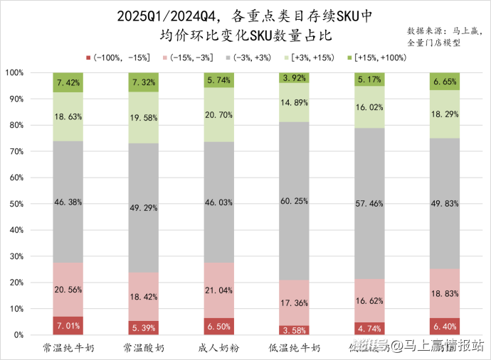 進(jìn)一步觀察2025Q1/2024Q1同比下,存續(xù)SKU的均價(jià)走勢,以五個(gè)區(qū)間劃分其均價(jià)對應(yīng)的SKU數(shù)量的不同狀態(tài):(-100%,-15%]表明件均價(jià)明顯下浮,(-15%,-3%]表明件均價(jià)輕微下浮,(-3%,3%)表明件均價(jià)持平,[3%,15%)表明件均價(jià)輕微上浮,[15%,100%)表明件均價(jià)明顯上浮。