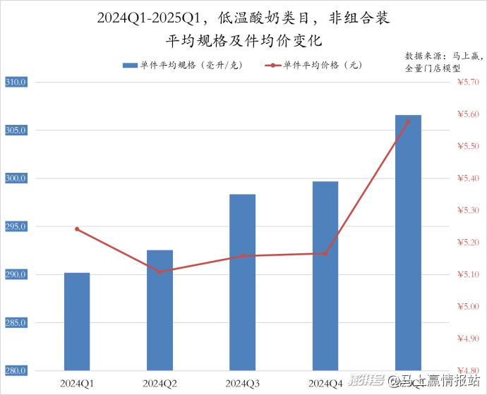 同樣是分組合裝與非組合裝來看,低溫酸奶非組合裝產(chǎn)品的件均規(guī)格從2024Q1的290毫升穩(wěn)步增加至2025Q1超過305毫升。而件均價(jià)則變動(dòng)較大,2024Q1至Q2從5.2元降低至5.1元,2024Q3和Q4均小幅度提升,2025Q1大幅提高至5.6元,企業(yè)或正在通過“規(guī)格擴(kuò)容+功能升級”重塑性價(jià)比,匹配消費(fèi)者對低溫酸奶產(chǎn)品的新需求。
