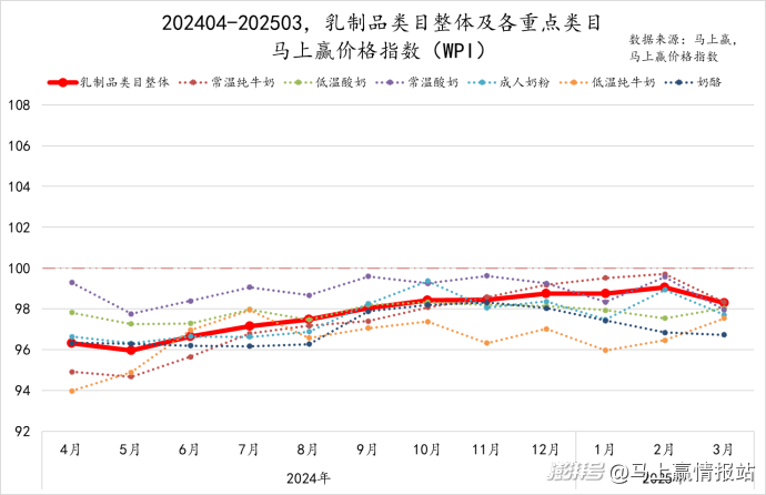 為了更好地分析乳制品類目整體價(jià)格持續(xù)變動(dòng)和走勢,我們拉取了該類目202404-202503的馬上贏價(jià)格指數(shù)WPI(詳細(xì)介紹參見:新產(chǎn)品丨馬上贏價(jià)格指數(shù)(WPI)發(fā)布啦!)。該指標(biāo)以100為基準(zhǔn)值,其數(shù)值上下波動(dòng)為類目的價(jià)格指數(shù)與去年同期價(jià)格指數(shù)的相對百分比,100表示與去年同月持平,高于100表示同比價(jià)格指數(shù)上升,低于100則表示同比價(jià)格下降。