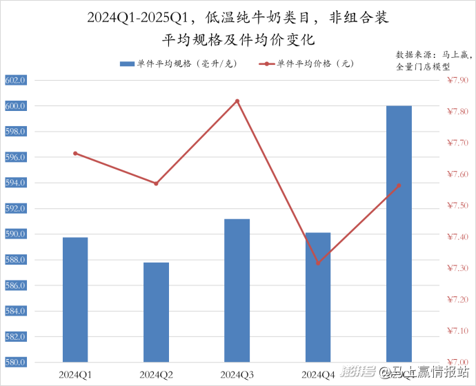 從低溫純牛奶非組合裝產(chǎn)品件均規(guī)格來看,2024年在588-592毫升波動(dòng)變化,2025Q1增加至600毫升。件均價(jià)走勢與規(guī)格相似,在經(jīng)歷了兩個(gè)季度的波動(dòng)后,2024Q4出現(xiàn)驟減,從7.8元降低至7.3元,而后回升至7.6元。