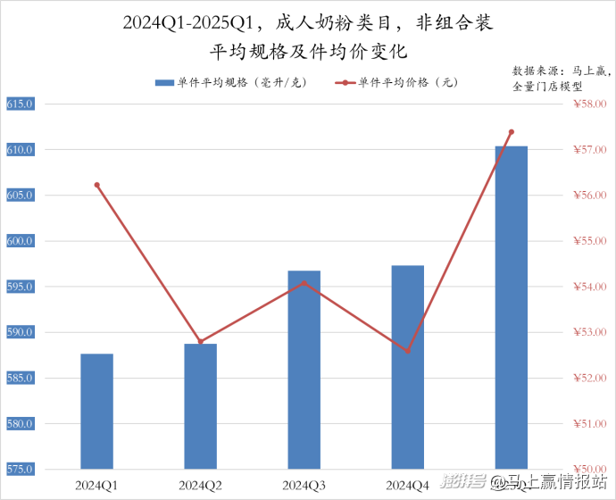 在成人奶粉市場中,非組合裝產(chǎn)品的件均規(guī)格五個(gè)季度連續(xù)增長,2025Q1更是提升至610g,同比提升超20g/件。件均價(jià)格則呈現(xiàn)季節(jié)性變動(dòng),Q1均處于較高水平,2025Q1更是超過57元,達(dá)到五個(gè)季度峰值,2024Q2至Q4則處于52-54元區(qū)間。