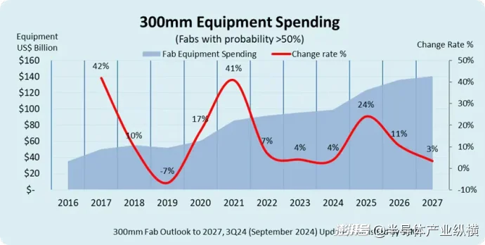 2025年到2027年,全球300mm晶圓廠設(shè)備支出將達(dá)到4000億美元