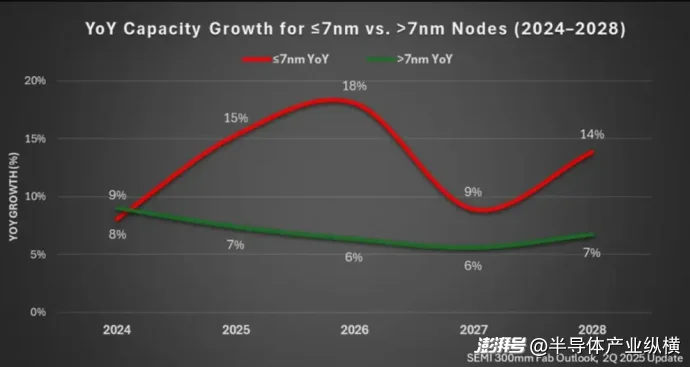 這一增長(zhǎng)的關(guān)鍵驅(qū)動(dòng)力是先進(jìn)制程產(chǎn)能(7nm及以下)的持續(xù)擴(kuò)大,預(yù)計(jì)將增長(zhǎng)約69%,從2024年的85萬wpm增至2028年的歷史高點(diǎn)140萬wpm——復(fù)合年增長(zhǎng)率約為14%,是行業(yè)平均水平的兩倍。SEMI 預(yù)計(jì)先進(jìn)制程產(chǎn)能將在2026年達(dá)到重要里程碑,首次突破每月百萬片晶圓,產(chǎn)能達(dá)到116萬wpm。