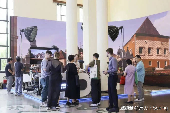 “3、2、1,ACTION!”隨著工作人員的一聲令下, 戴上軍棉帽,站在超高清大屏前的張女士瞬間穿越到飄著鵝毛大雪的俄羅斯,她腳下踩著茫茫白雪,身后是俄羅斯的古典建筑。這樣的場景在上海國際電影電視節(jié)國際影視市場頻頻上演,莫斯科電影委員會(huì)展臺(tái)前人頭攢動(dòng),大家紛紛前來體驗(yàn)“虛擬拍攝”。