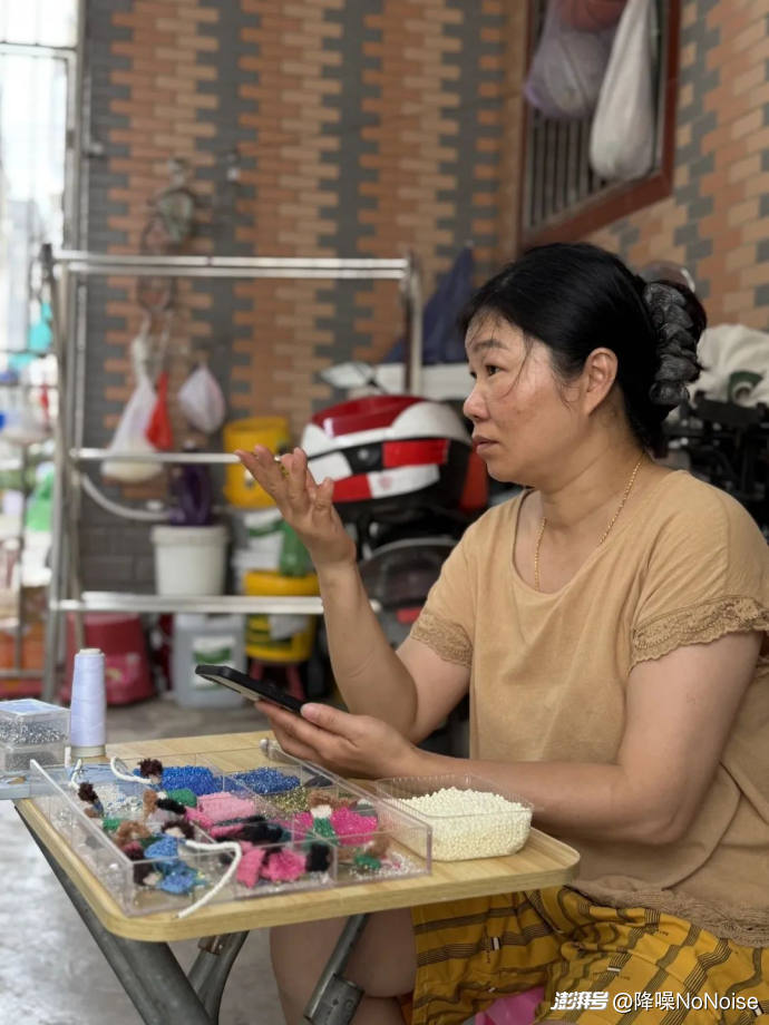 清花喜歡一邊唱潮劇一邊鉤織。更年輕的燕珍、秋蓮都喜歡獨自在家里做工。她們會在桌子上放一個手機(jī)支架,有時候眼睛盯著手機(jī)視頻,手下的鉤織卻從未降速。