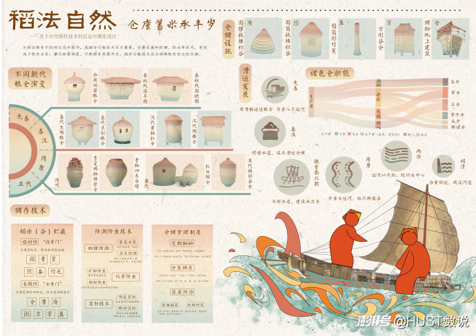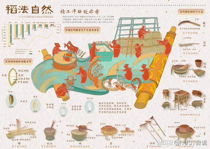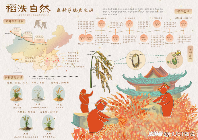 第一張圖“良種孕穗啟農(nóng)源”的“稻種馴化過(guò)程”部分的地圖基于鏑數(shù)圖表網(wǎng)站下載的審圖號(hào)為GS(2019)756號(hào)的標(biāo)準(zhǔn)地圖制作,底圖無(wú)修改,經(jīng)過(guò)上色、標(biāo)注位置等美工處理。水稻適配土壤”部分使用了人工智能輔助工具 Midjourney。水稻結(jié)構(gòu)部分使用小紅書博主“秋秋媽媽畫自然”的素材圖。