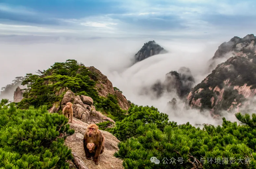 在安徽黃山風(fēng)景區(qū)光明頂拍攝的一幅作品。當(dāng)天,黃山雨后天晴,景區(qū)出現(xiàn)壯觀云海美景,一只黃山短尾猴帶著“兒女”從峽谷往光明頂走來(lái),給靜美的山谷增添了幾分靈氣,游人也倍感驚喜,形成了游人和短尾猴共享勝景的和諧畫(huà)面。這樣的作品也呼吁大家保護(hù)自然給予猴子等所有動(dòng)物們一個(gè)美好的家園。