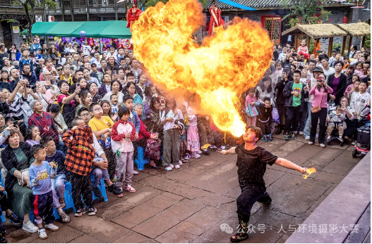 四川省瀘州市合江縣堯壩古鎮(zhèn)宋潮非遺節(jié),氣勢(shì)磅礴的川劇吐火表演吸引游客駐足觀看。
