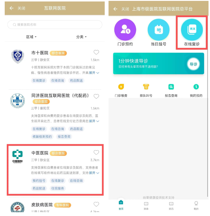 第二步:搜索想去的醫(yī)院,也可按條件進(jìn)行篩選,隨后點(diǎn)擊進(jìn)入醫(yī)院服務(wù)頁(yè)面,選擇對(duì)應(yīng)的復(fù)診服務(wù)(以上海中醫(yī)醫(yī)院線上復(fù)診為例)。