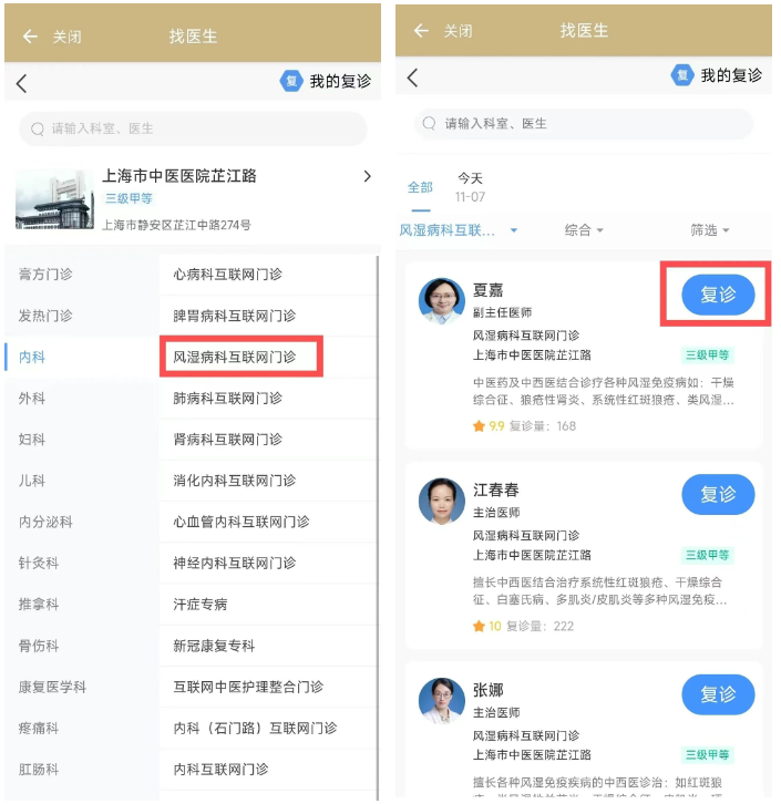 第三步:選擇對(duì)應(yīng)的科室以及醫(yī)生,點(diǎn)擊“復(fù)診”按鈕(以上海中醫(yī)醫(yī)院“風(fēng)濕病科互聯(lián)網(wǎng)門診”線上復(fù)診為例)。