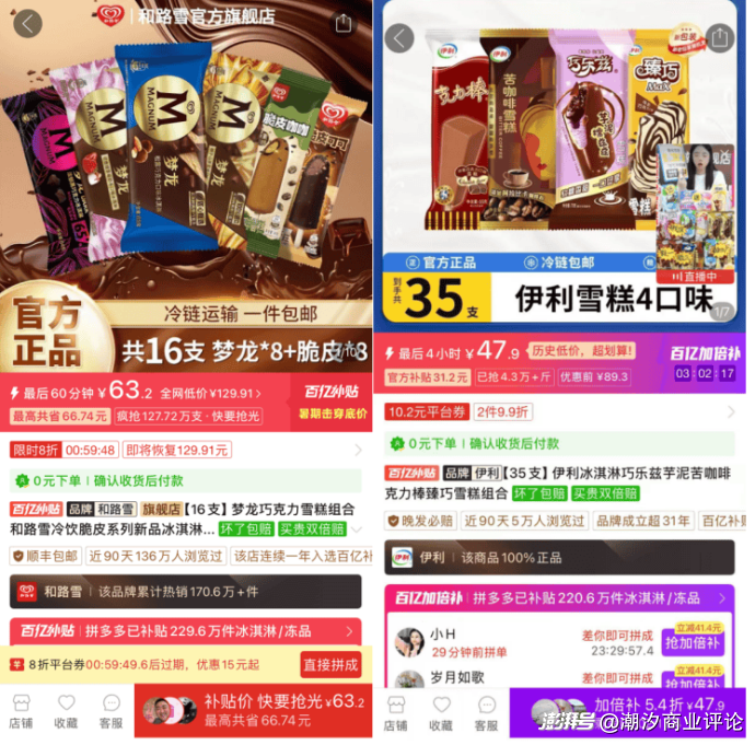 《潮汐商業(yè)評論》也逛了下附近的社區(qū)便利店,今年的冰淇淋市場主流價格帶基本維持在1元—5元。一些大品牌也在降價,比如,在拼多多百億補(bǔ)貼上,8支夢龍+8支脆皮只需要63.2塊錢,而伊利苦咖啡、巧樂茲、臻巧和克力棒組合裝35支只需要47.9元。