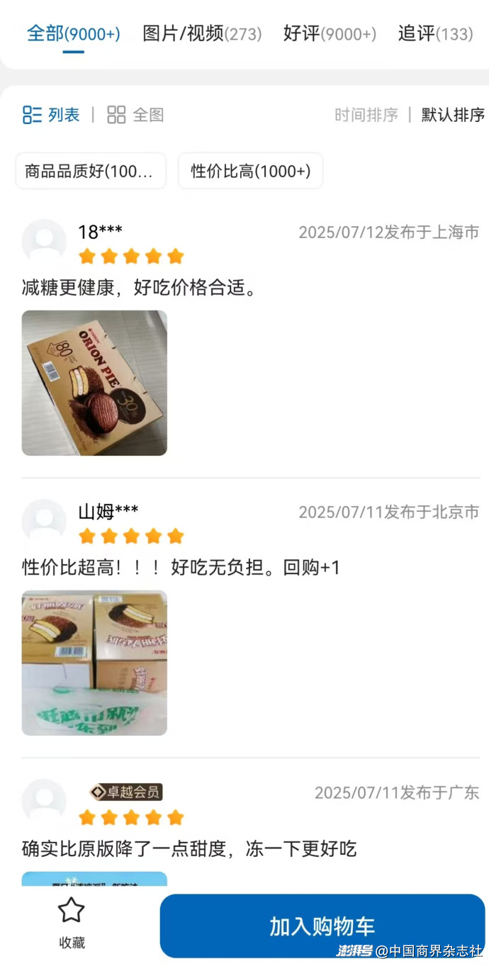 記者注意到,一款售價(jià)49.9元48枚的低糖好麗友派成為社交平臺(tái)上被“集火”的目標(biāo)之一。該款產(chǎn)品主打“增加30%可可成分”“減糖80%”和“0反式脂肪酸”。盡管社交平臺(tái)上出現(xiàn)了不少聲音,稱(chēng)“與普通的好麗友派沒(méi)有區(qū)別”“減糖還是很甜”,但記者在山姆App上發(fā)現(xiàn),該款商品的9000+條評(píng)價(jià)中,有著93.7%的好評(píng)率?!按_實(shí)比原版降了一點(diǎn)甜度,凍一下更好吃”“是小時(shí)候的味道,但不是那么甜”“二次回購(gòu),家人朋友都喜歡吃”“好吃無(wú)負(fù)擔(dān)”等評(píng)價(jià)層出不窮。
