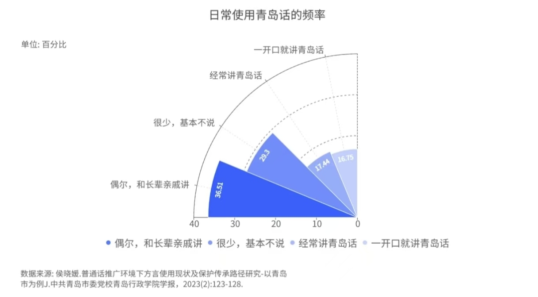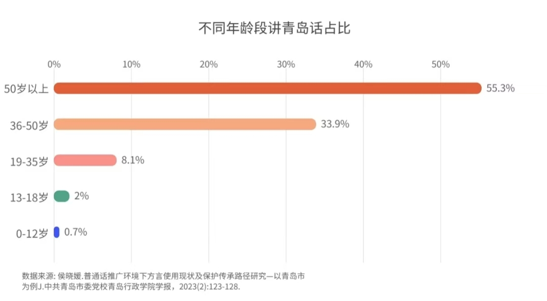以青島方言為例,截止2022年9月8日,其在13歲-18歲的青少年群體中使用率僅為2%,而在0-12歲的少兒群體中,這一比例更是低至0.7%;
