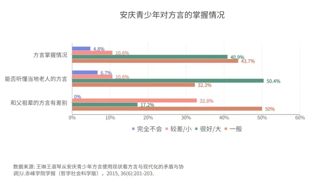 安慶方言的掌握情況同樣堪憂,完全掌握該方言的青少年比例僅有4.8%,基本掌握的有10.6%,兩者加起來(lái)尚不足該群體整體的16%。