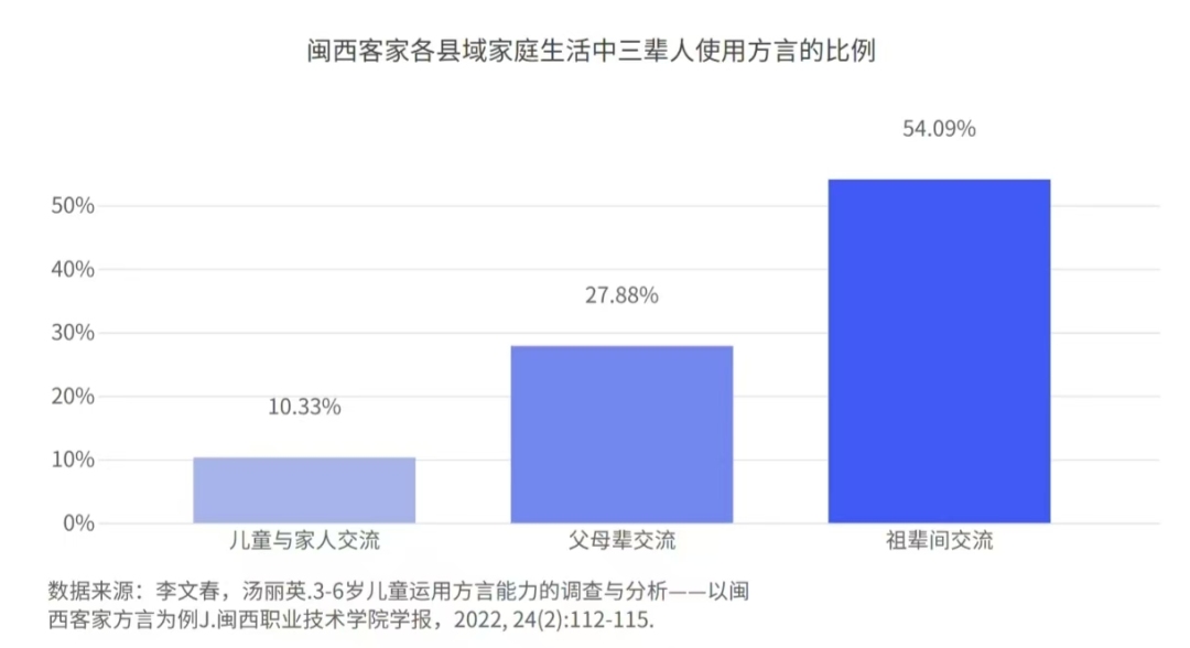 閩西客家話的使用率清晰地反映了這一趨勢(shì):在祖輩間的使用率高達(dá)54.09%,到父母輩已降至27.88%,而兒童與家人交流時(shí),僅剩10.33%。