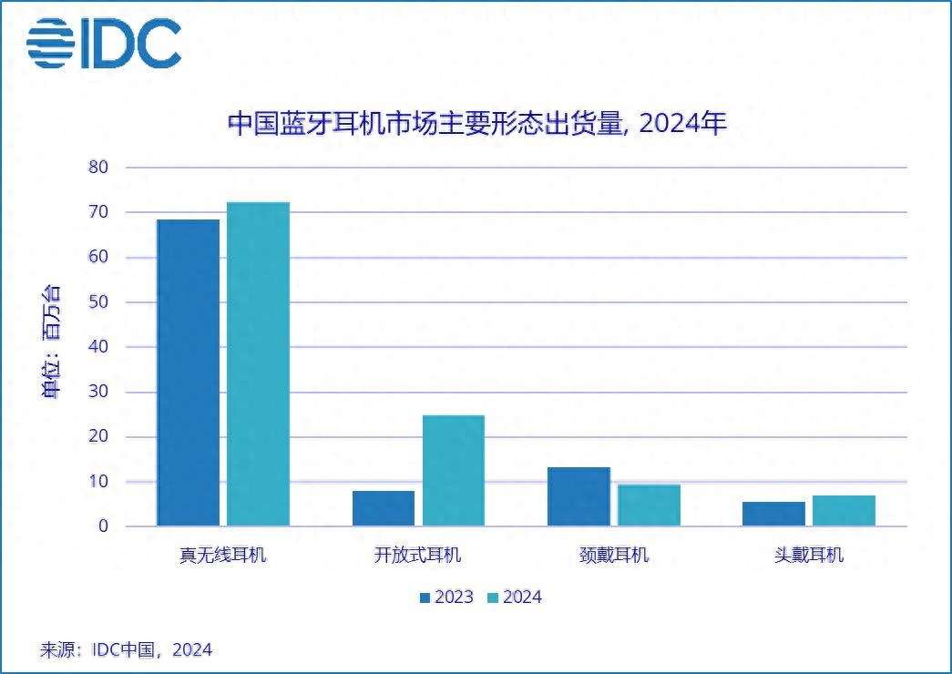 IDC 在2025 年 3 月發(fā)布的《中國無線耳機市場月度跟蹤報告》顯示,2024 年中國藍牙耳機市場出貨量達 11353 萬臺,同比增長 19%。不過令人意外的是,曾被認為會被真無線耳機、開放式耳機取代的頭戴式耳機,24 年出貨量也達到了 692 萬臺,同比增長 26.1%。