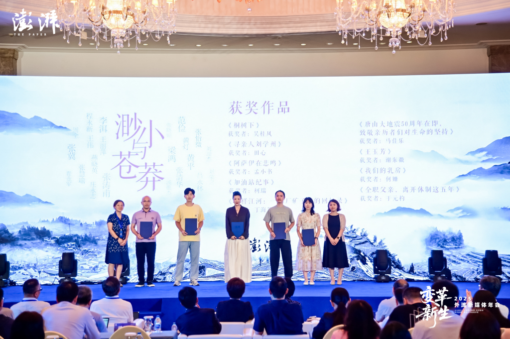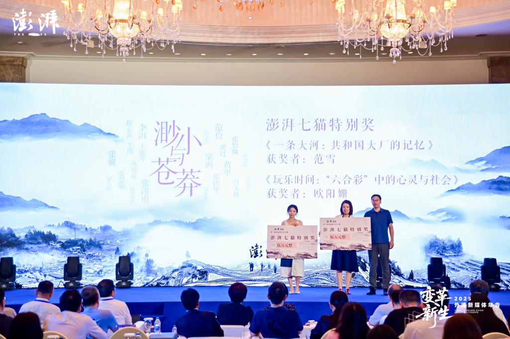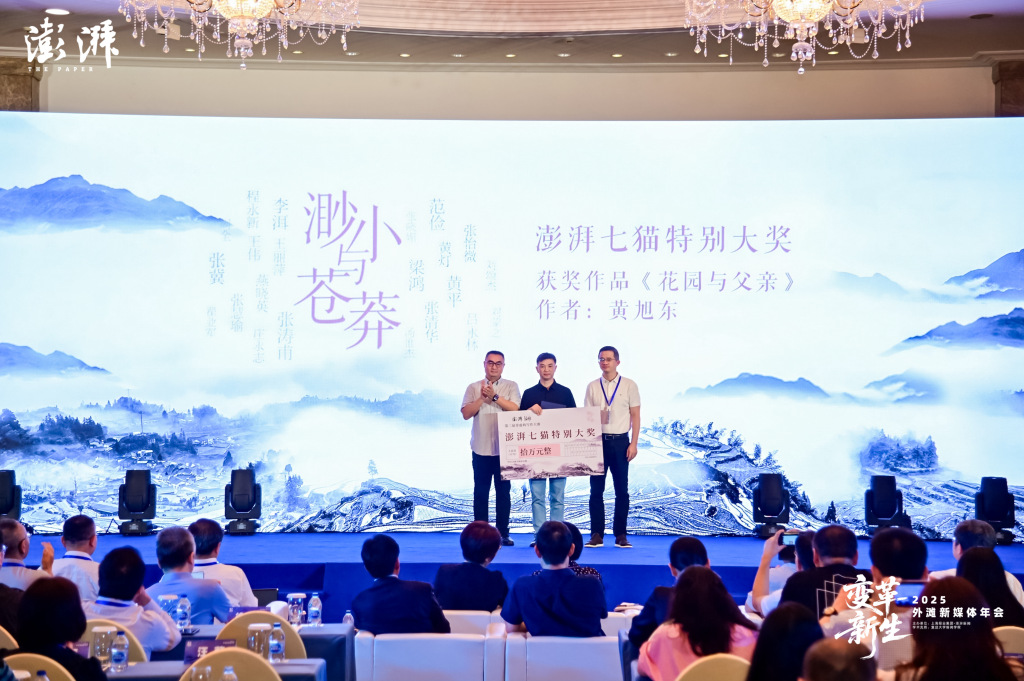 澎湃新聞常務(wù)副總裁徐香、澎湃新聞副總編輯李云芳、澎湃新聞副總編輯黃芳、澎湃新聞編委何濤以及七貓聯(lián)合創(chuàng)始人、高級(jí)副總裁王黎輝共同為上述獲獎(jiǎng)?wù)哳C獎(jiǎng)。