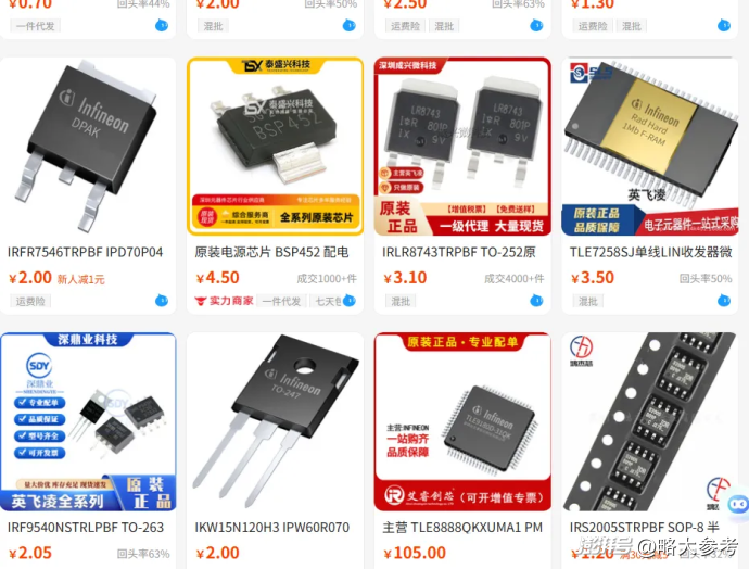 在1688上搜索英飛凌,仿佛進入了一個廉價地攤,各種芯片大多數(shù)還不到5塊錢,有的只有幾毛錢。在二手交易領(lǐng)域,這樣的芯片一般都不配流入閑魚市場,而是大多在廢品收購站完成交易。