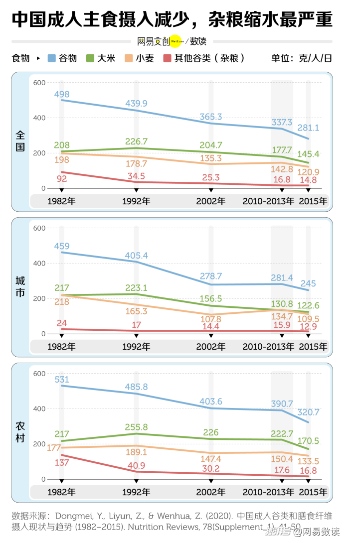 1982 年,中國(guó)成人日均攝入 498 克谷物;到 2015 年,下降到 281.1 克。在此期間,大米從 208 克減至 145.4 克,小麥從 198 克降到 120.9 克。