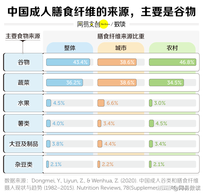膳食纖維的來(lái)源,一定程度上也能反映出城鄉(xiāng)飲食結(jié)構(gòu)的差異。